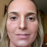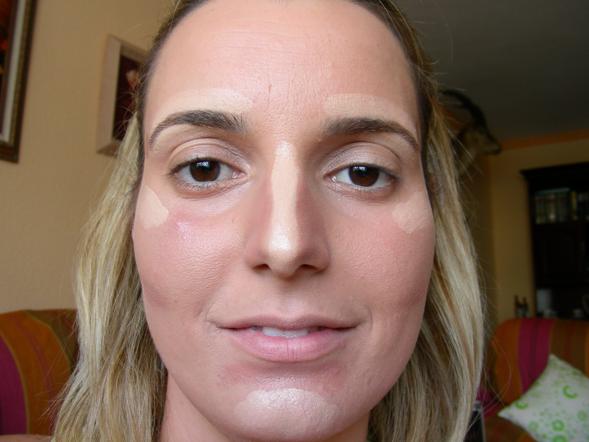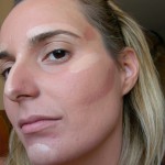 Aquí lo que hay que tener en cuenta es que lo claro agranda, ilumina o saca hacia afuera, y lo oscuro, hunde, disimula o empequeñece: En estas fotos, he aplicado el tono claro sobre el arco de las cejas y en su arco superciliar (que es la zona que justo está debajo de ellas), el tabique nasal, bajo las esquinas exteriores de los ojos y en la barbilla. Bajo los pómulos, en el hueco de la barbilla y en las sienes, usé oscuro para como anteriormente he explicado, hundir la zona.
