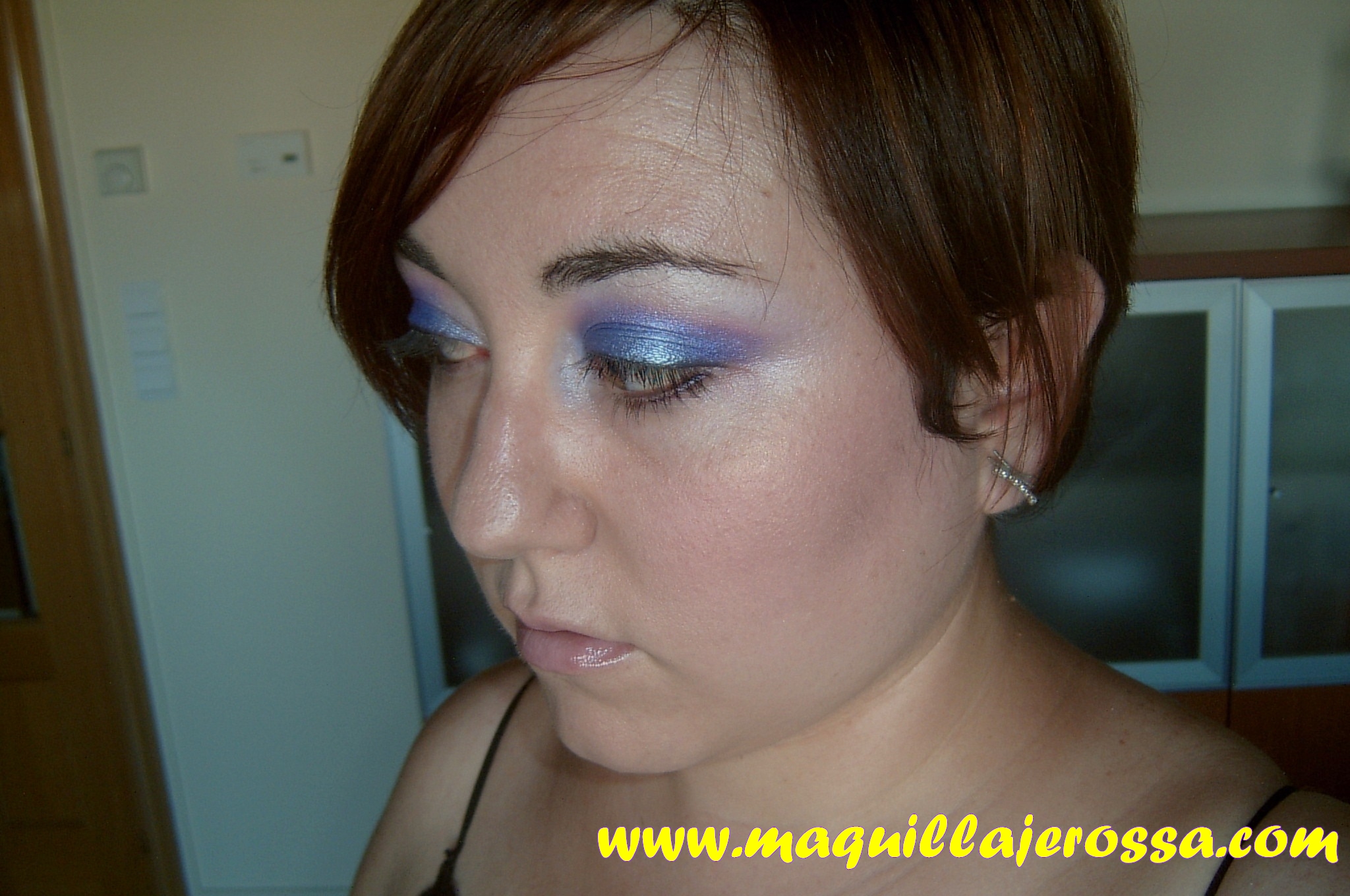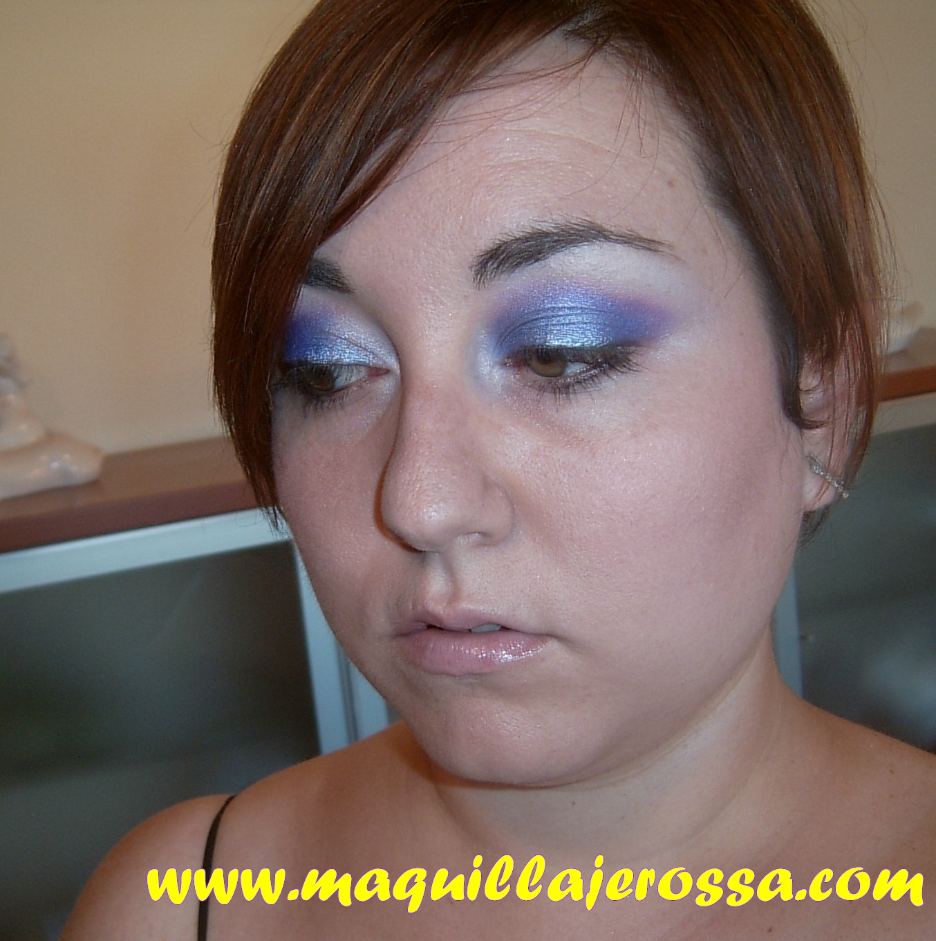 En esta fotografía puedes var la línea azul que te pongo. Con ella quiero decir que deberías subir un pelín más las sombras que has usado, que creo que es un poco mezcla de azul y morado y difuminarla como bien has hecho, para que cuando abras el ojo, se vea un poquito más de color, si no se ve demasiado arco ciliar. Queda la parte de arriba demasiado desnuda.