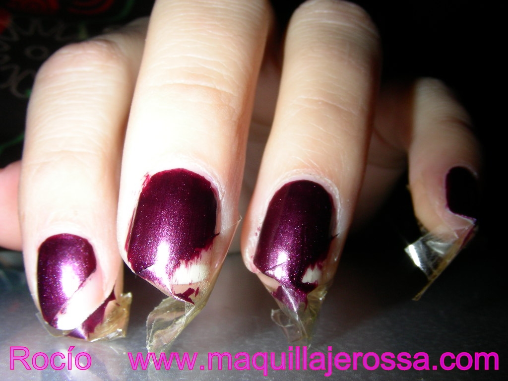 No retires la cinta hasta que des dos capas de esmalte granate y estén las dos completamente secas. Aquí ya con las dos capas pero aún con la cinta puesta.