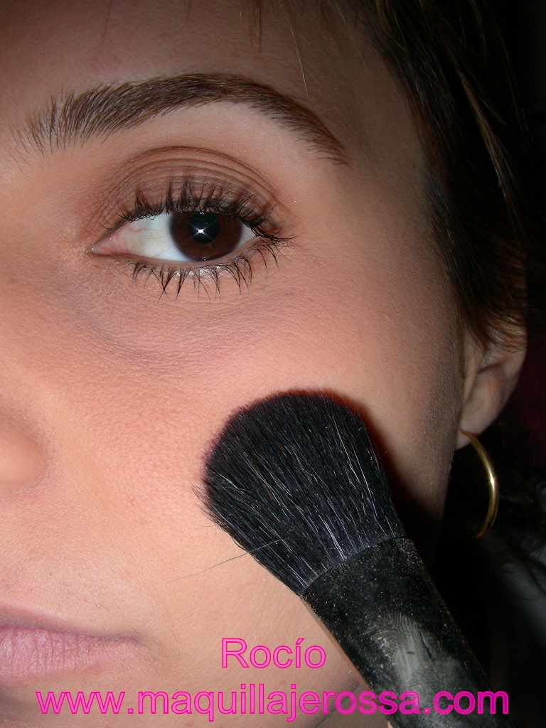 Para el colorete, coge una brocha que no sea demasiado grande, toma el color que sea rosado y empieza aplicándolo desde el centro de la mejillas, en dirección ascendente hacia las sienes.