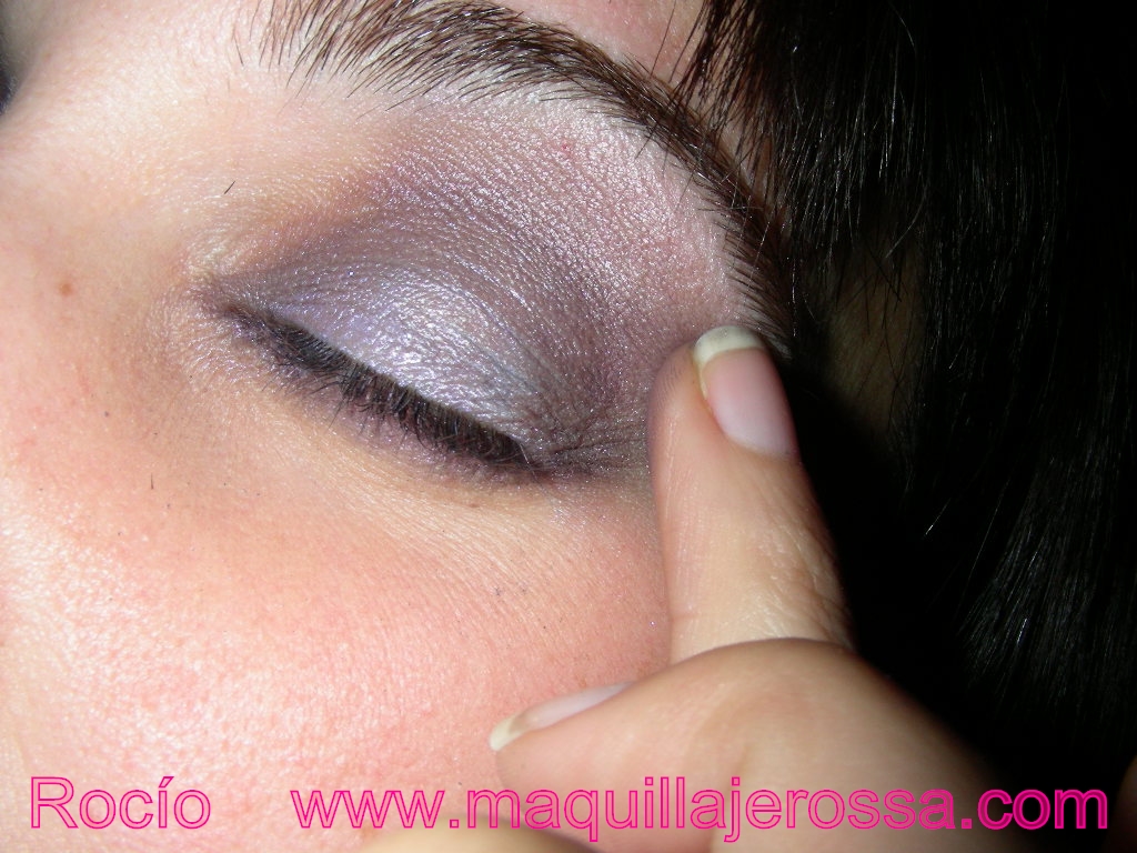 Y seguimos con los dedos. Con otro poco (pero muy poco) de sombra en crema malva, estiramos los extremos del maquillaje. Emborronamos un poquito. Esto se hace estirando la piel con el dedo. Hay que emborronar arriba y abajo.