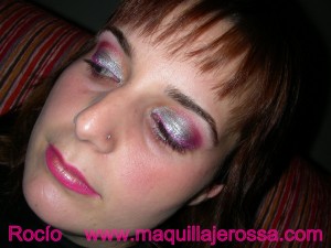 Moja el pincel delineador, y coge un poquito de pigmento «Fucsia» y con él, delinea por arriba y por abajo las pestañas, (en párpado superior e inferior). Tendrás que hacerlo poco a poco porque el pigmento mojado, en cuanto se deposita, ya no sigue pintando o maquillando, con lo que tendrás que humedecer y coger pigmento varias veces.